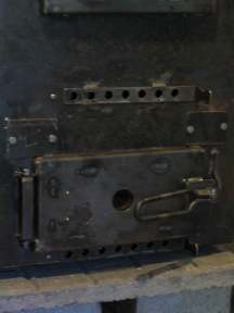 The two covers at the top corners of the door provide access to the air ducts at the ends of the refractory blocks. Access was needed during assembly to create the seal between the cast blocks and the steel cabinet shell. |
