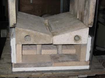 | Here is a pair of replacement refractory castings just before they were removed from a friend's pottery kiln. The first ones broke when I tried to remove them to reseal the joints at the front and back of the firebox. The originals hadn't been fired this way. The second ones were much harder after firing. If you tapped them with something metal they would ring like a wine glass. These ones have been used to two years and they still have sharp edges like new. |